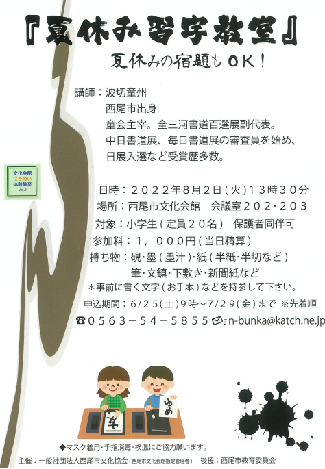 西尾市文化会館自主企画事業「夏休み習字教室」※ご好評につき定員に達しましたので受付終了とさせていただきます。