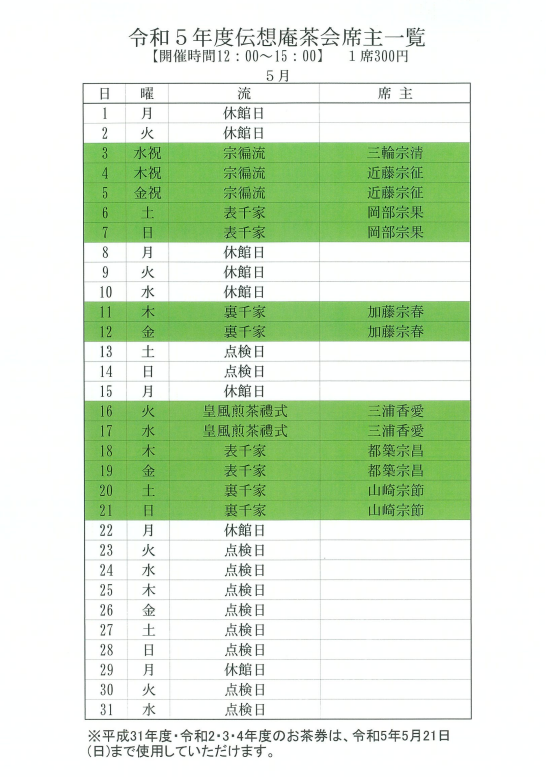 伝想庵茶会は文化会館の大規模改修工事のため、令和5年5月22日(月)より、お休みします。