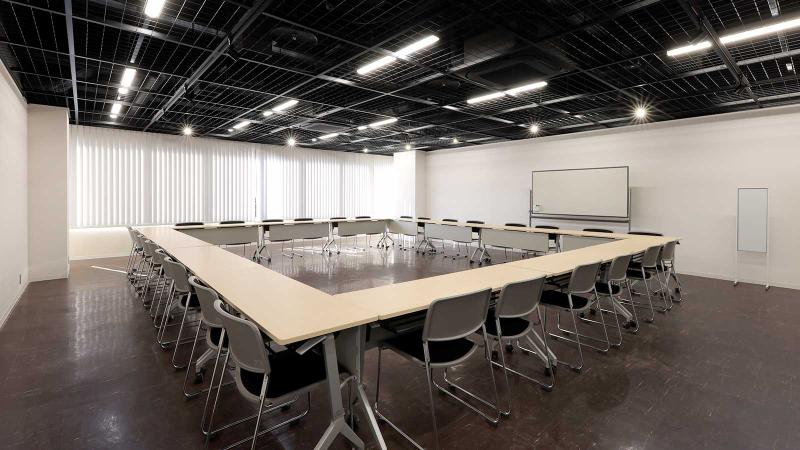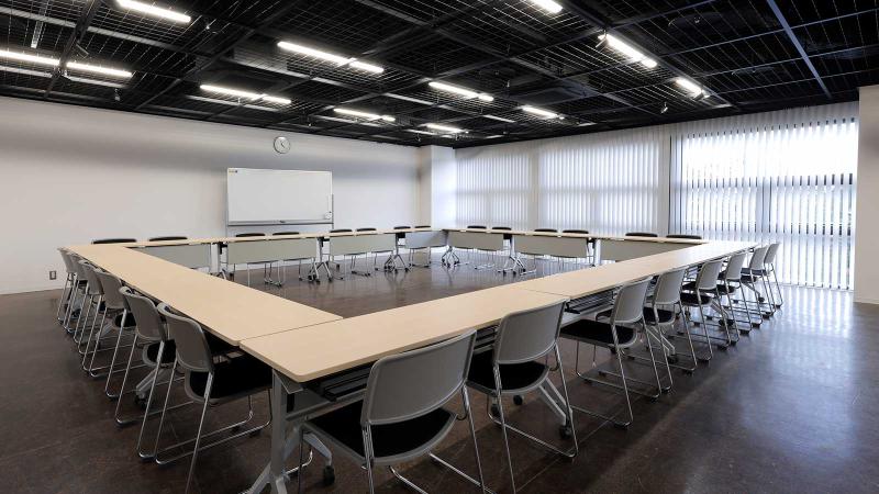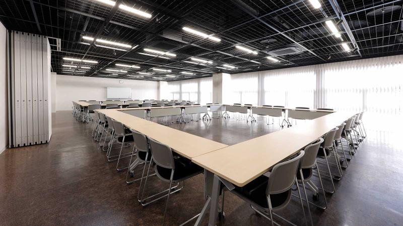 会議、研修会、講習会、舞台練習など、多目的に活用できる広々とした空間です。 (各部屋に予備イスが4脚あります。)